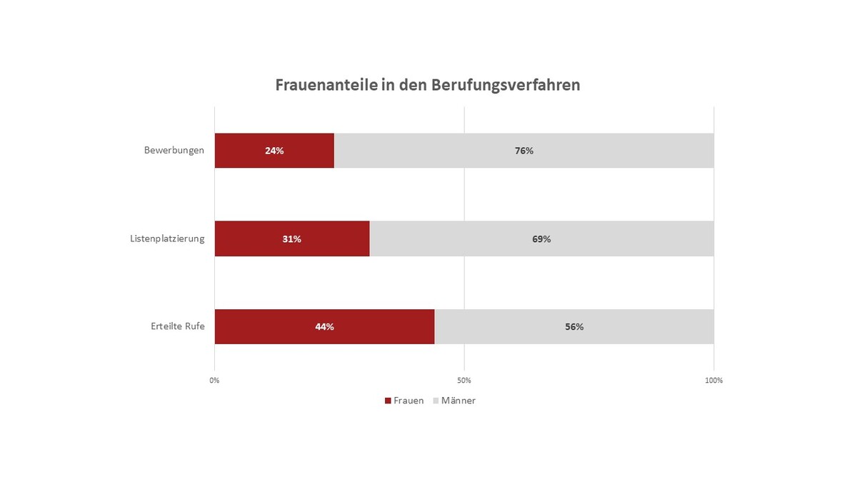 Bei der Betrachtung der Berufungsverfahren zur Besetzung einer Professur zeigt sich im Jahr 2023 eine deutliche Steigerung der Frauenanteile von Etappe zu Etappe. Während der Anteil der Bewerbungen von Frauen bei 24% lag, gingen 44% der Ruferteilungen an Frauen. Im Vergleich zum Vorjahr hat sich der Anteil der Ruferteilungen an Frauen damit um 14 Prozentpunkte erhöht. Nachdem der Anteil der Frauen unter den Bewerbungen während der Corona-Pandemie stark zurück gegangen war, knüpft dieser im Jahr 2023 an die Ausgangslage von 2019 an.