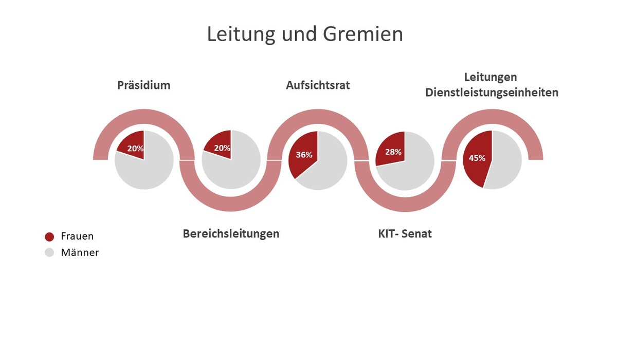 Der Frauenanteil bei den Präsidiumsmitgliedern liegt im Jahr 2023 ebenso wie bei den Bereichsleitungen bei 20%. Im KIT-Senat sind 28% der Mitglieder Frauen. Der Frauenanteil bei den Mitgliedern des Aufsichtsrates KIT beträgt 36%. Bei den Leitungen der Dienstleistungseinheiten, Stabsstellen und zentralen wiss. Einrichtungen liegt der Frauenanteil in 2023 bei 45%.