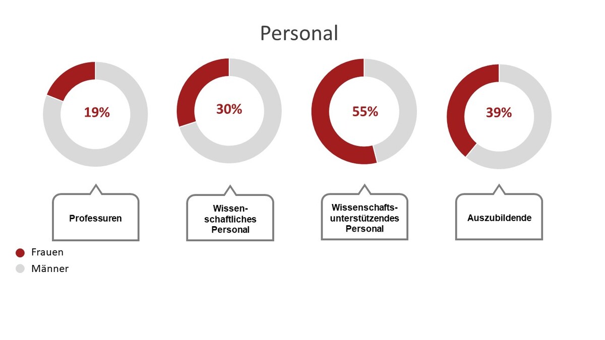 Der Frauenanteil bei den Professuren am KIT lag im Jahr 2023 bei 19% und ist damit im Vergleich zum Vorjahr um einen Prozentpunkt gestiegen. Beim wissenschaftlichen Personal lag der Frauenanteil in 2023 bei 30% und beim wissenschaftsunterstützenden Personal aus Verwaltung, Technik und Bibliothek bei 55%. Im Jahr 2023 ist bei den Auszubildenden der Anteil ein Anstieg um drei Prozentpunkte auf 39% zu verzeichnen.
