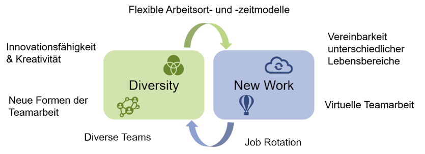 Im Diversity-Konzept des KIT ist die Ermöglichung und Berücksichtigung von individuellen Lebensentwürfen und -situationen, sowie die Entfaltung von Potentialen aller Beschäftigten festgehalten. Auch hierbei stehen neue, flexible und individuellere Formen der Arbeit im Fokus. Diversity und New Work unterstützen und bedingen sich also wechselseitig.