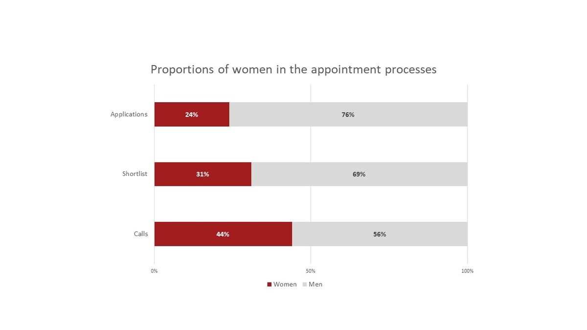 In examining the appointment processes for filling a professorship, a significant increase in the percentage of women at each stage is evident in 2023. While the proportion of female applicants was 24%, 44% of the professorship position were offered to women. Compared to the previous year, the percentage of offers extended to women has risen by 14 percentage points. After a substantial decline in the proportion of female applicants during the COVID-19 pandemic, the figures in 2023 are now aligned with the levels seen in 2019.