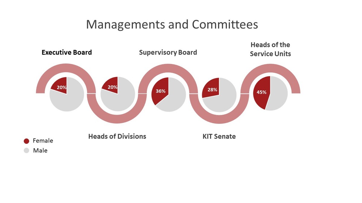 In 2023, the proportion of women among the members of the Executive Board is 20%, just as it is for the heads of divisions. Within the KIT Senate, 28% of the members are women. The proportion of women among the members of the KIT Supervisory Board is 36%. The proportion of women in the management of service units, staff units, and central scientific institutions is 45% in 2023.